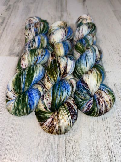 Artemis is a variegated colorway of royal blue and green with purple and brown speckles.