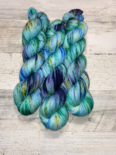 Atlas is striking yarn full of blues, green and yellow speckles.