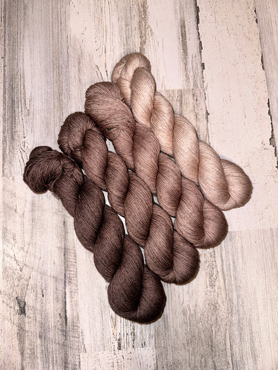 A Beautiful gradual fade of one of our favorite Jemstones! This set includes 4 skeins of our new Natchez fingering. Natchez is a wonderful blend of 50% Fine Superwash Merino Wool and 50% Pima Cotton. Each skein is 437 yds/100g for a total of 1748 yds/400g.