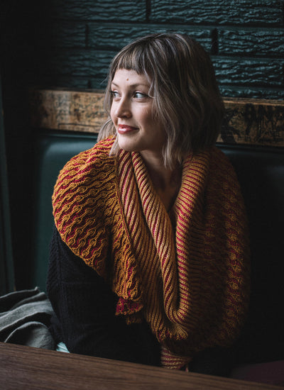 Rose Gold is worked in two color brioche from side to side to form what I like to call a peaked asymmetrical crescent! This shawl is one of my favorite shapes because it creates a long wingspan and a fairly shallow depth, so it is very wearable! The reversible brioche begs to hug the curves of your shoulders while the remaining length of the wings dance in a cascading spiral.