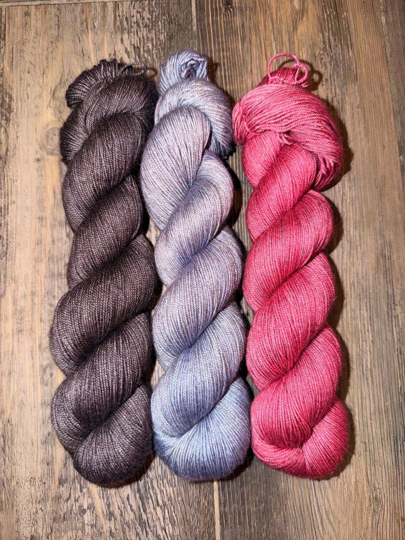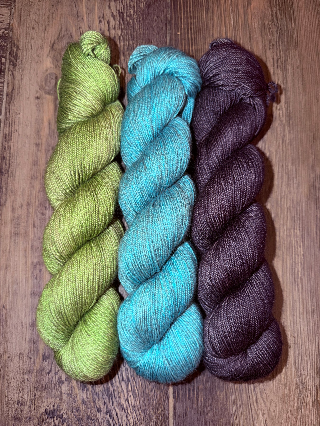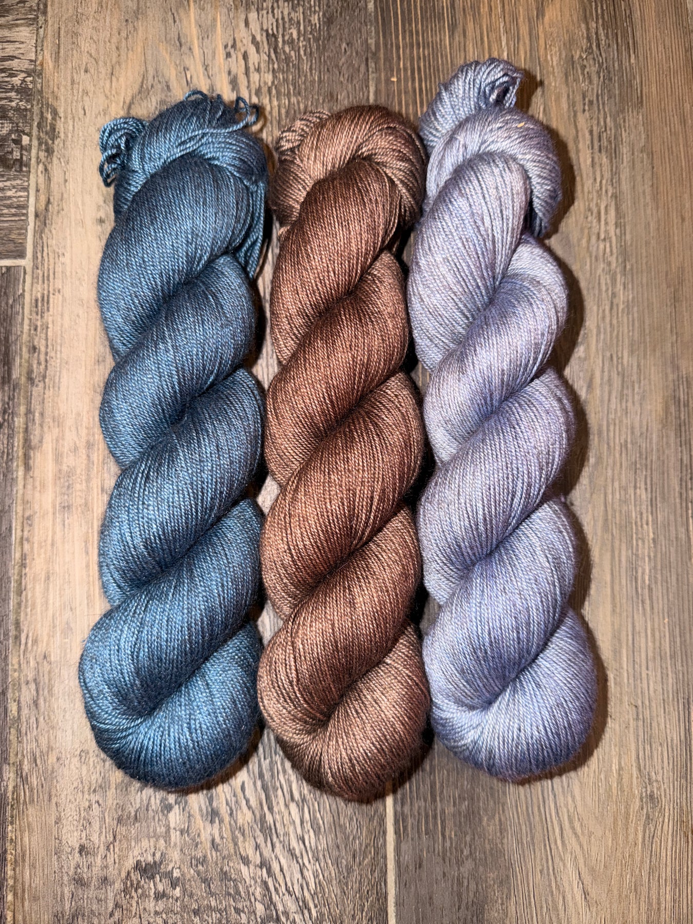 -Three skeins in our Yak base, a 65% SW Merino/ 20% silk /15% Yak.
