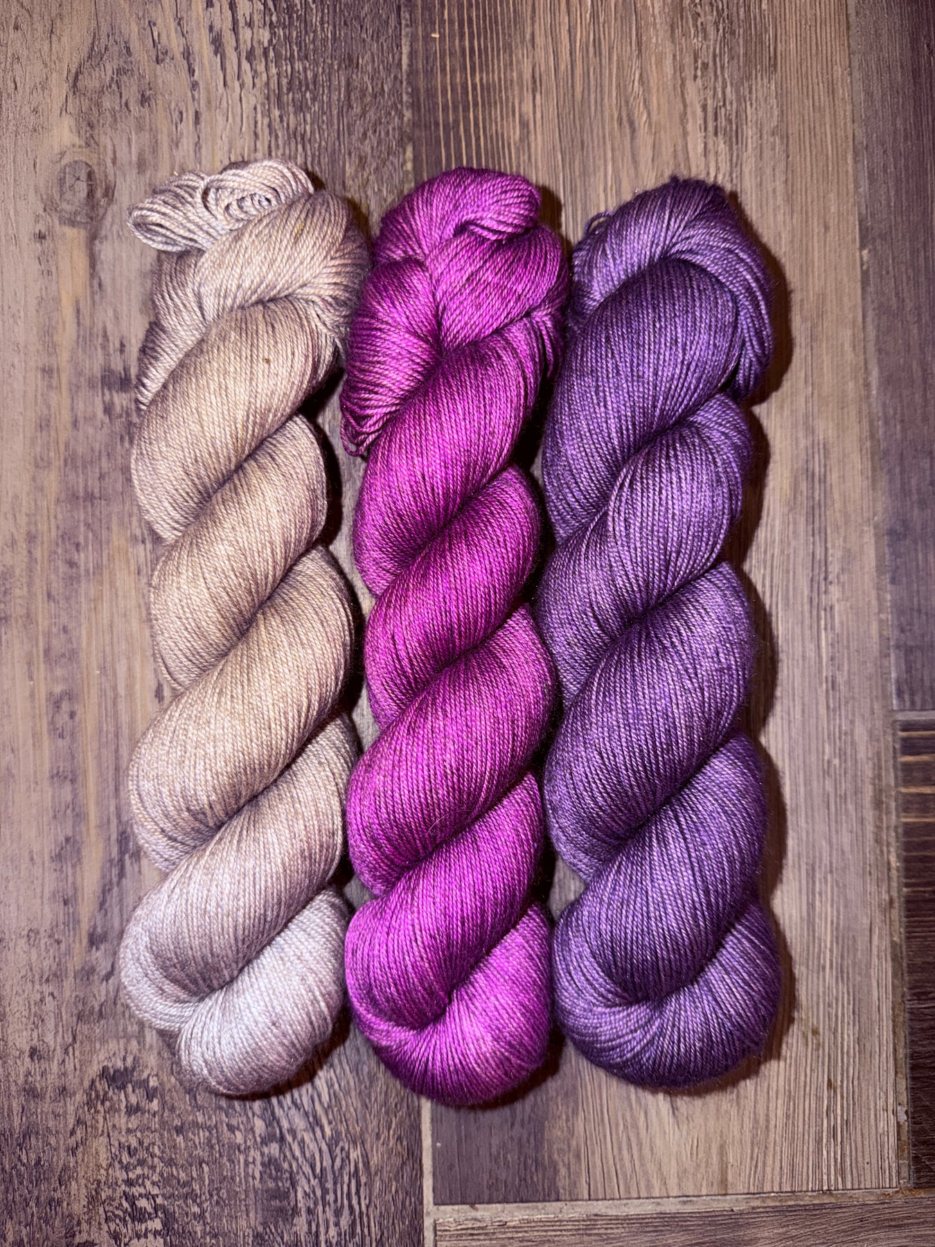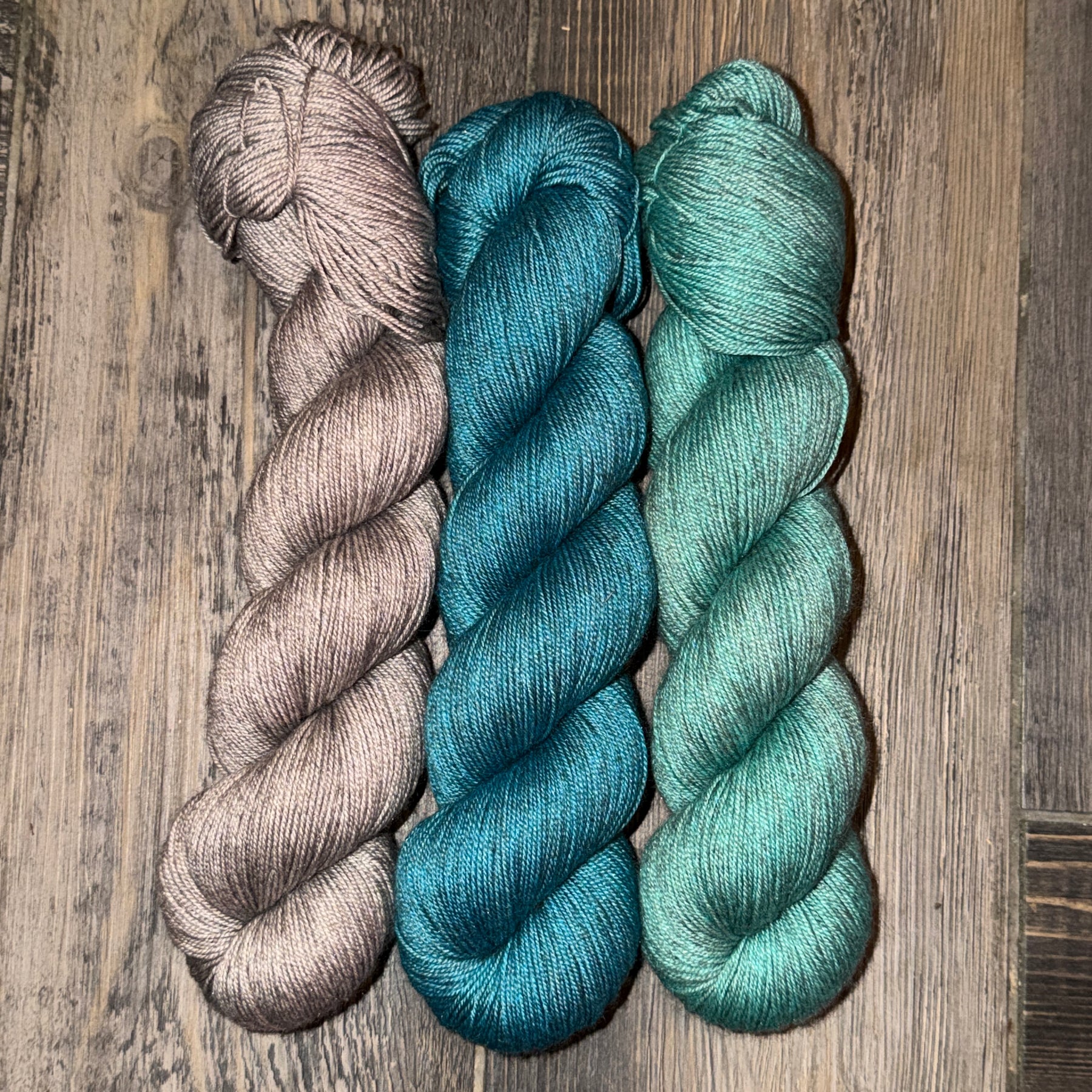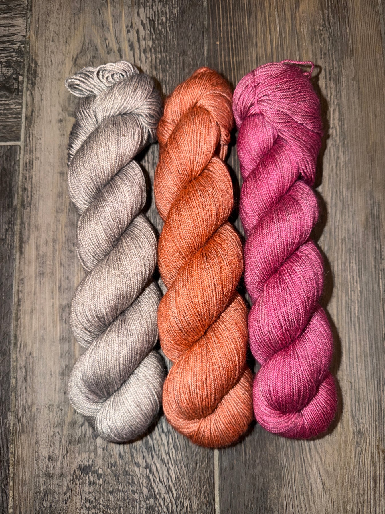 -Three skeins in our Yak base, a 65% SW Merino/ 20% silk /15% Yak.